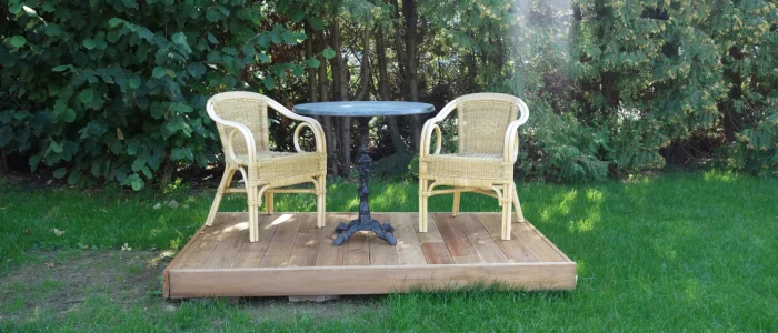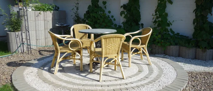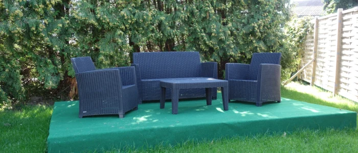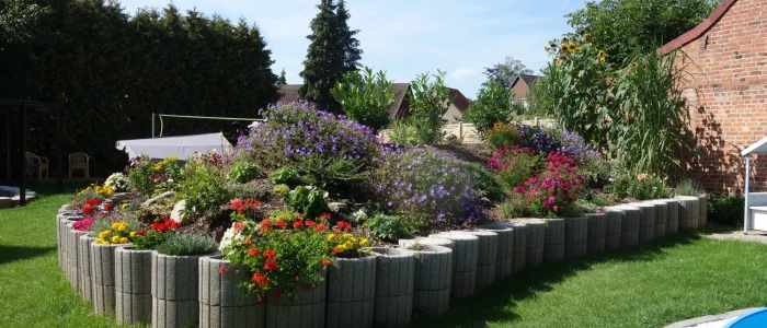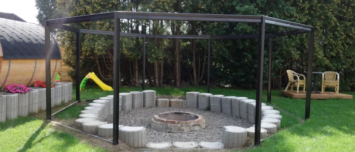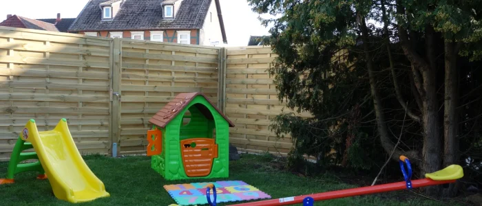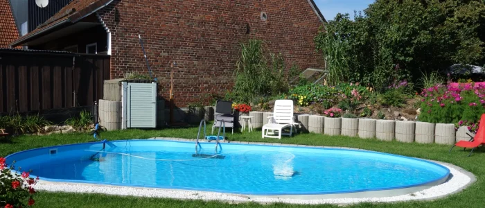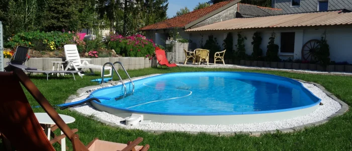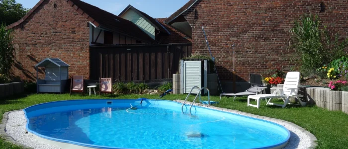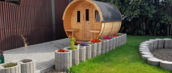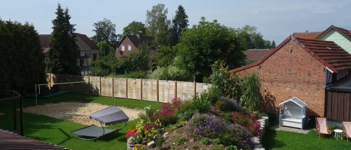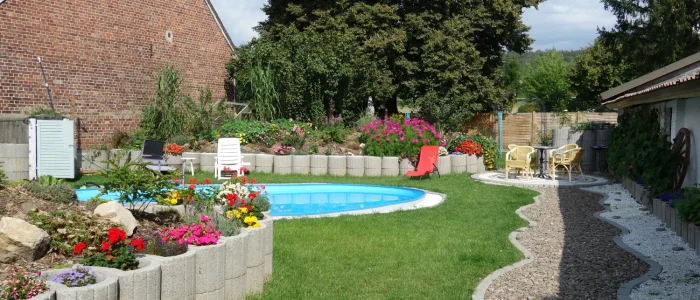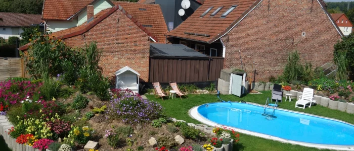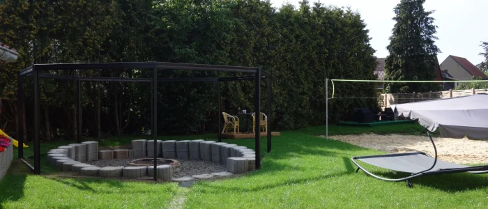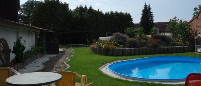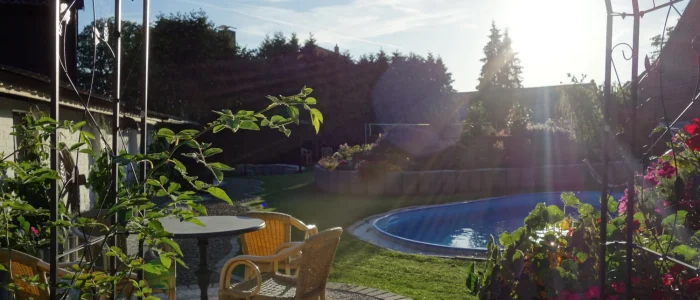 Die liebevoll gestaltete Außenanlage mit saisonalem Pool, überdachter Feuerstelle, gemütlichen Ruhezonen und einer Fasssauna lädt zum Entspannen ein.
